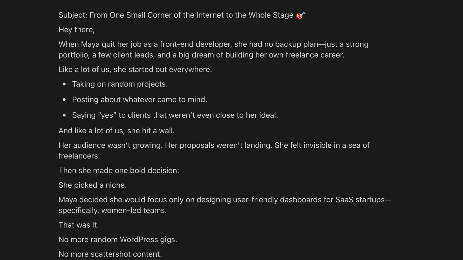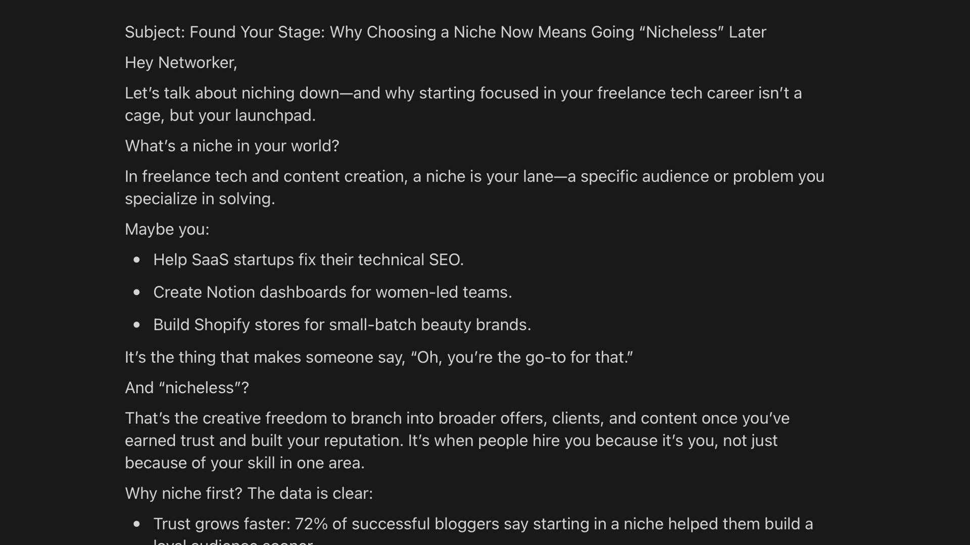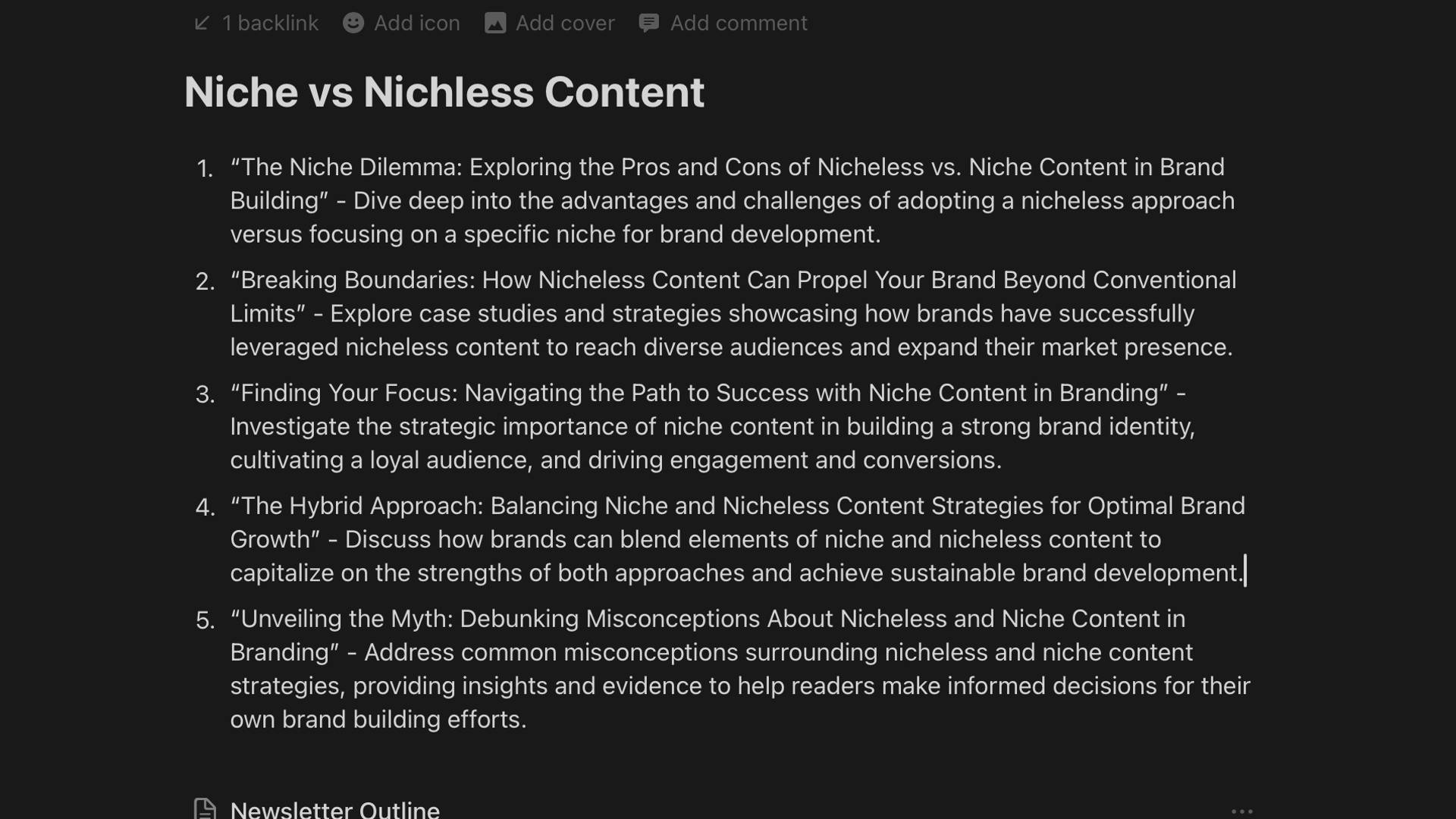 Here, I am structuring pages for a topic on Niche vs Nichless content. I have the ‘overview’ page or summary page. Which is linked to the Newsletter page that has a second version of the newsletter in a storytelling writing style.