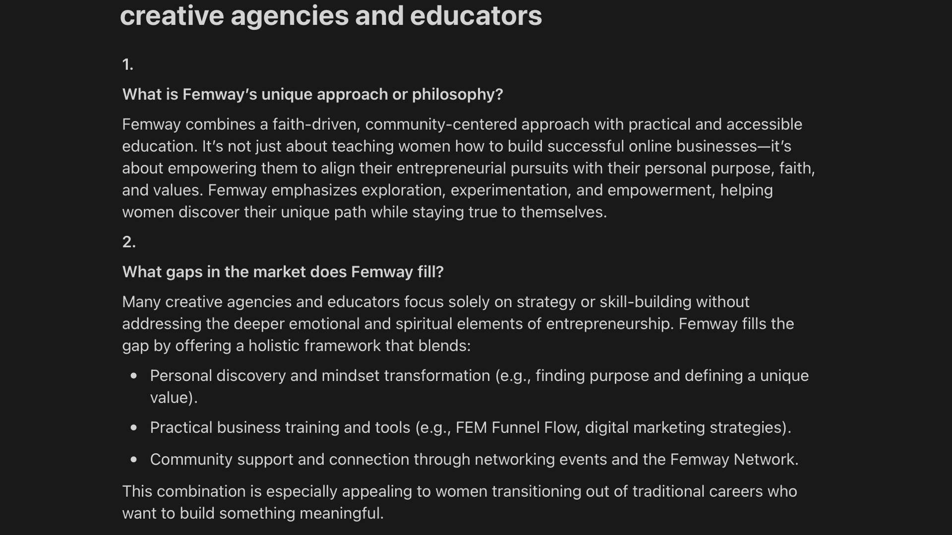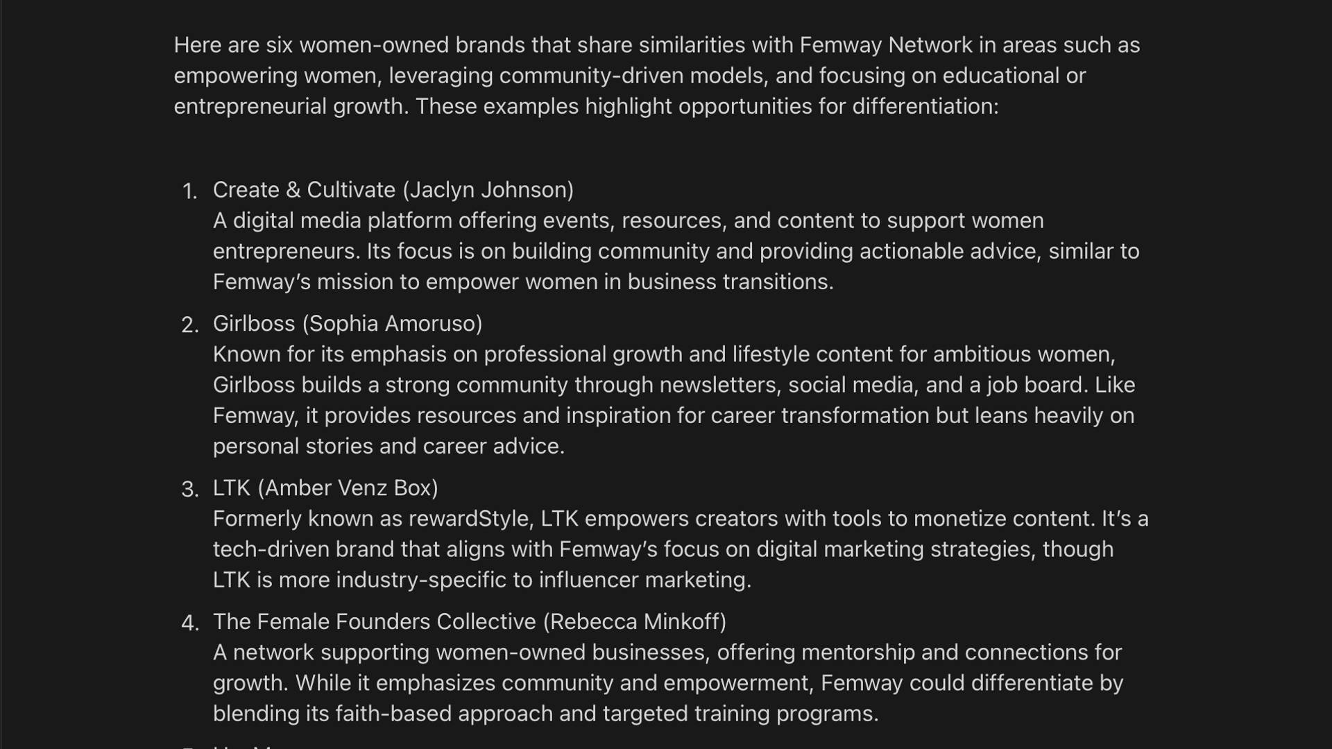 In the last screenshot, it lists 6 businesses that are similar to Femway in different ways. A way I plan on taking this a step further, is creating a brand page for each one.